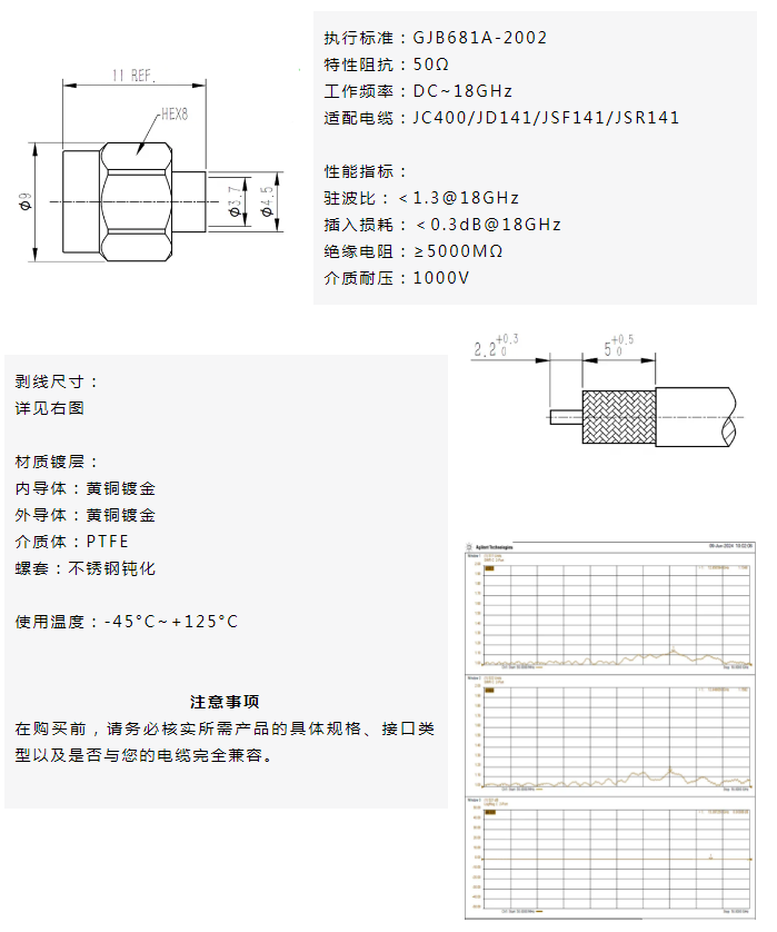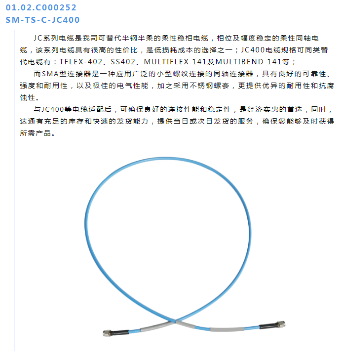 JC400電(diàn)纜優選: 不(bù)鏽鋼螺套SMA公連接器(πε←qì)
